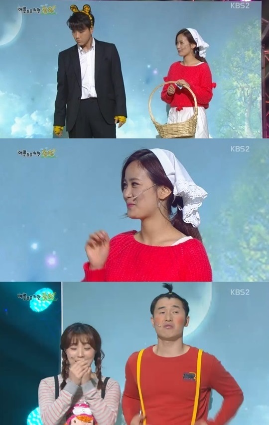 이날 ‘어른들을 위한 동화’는 전래동화 ‘해님달님’을 패러디한 내용으로 개그우먼 김지민이 아이들을 둔 미모의 떡집 주인, 이동윤이 떡집을 없애야 하는 호랑이 조폭 역으로 각각 출연했다.