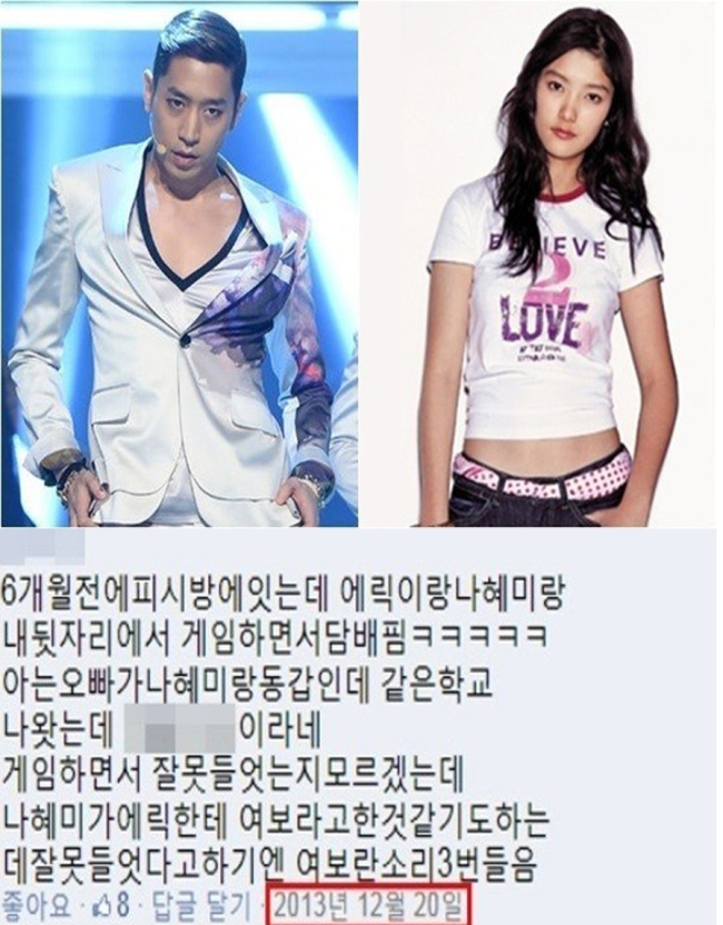 이 네티즌은 “6개월 전 피시방에서 에릭과 나혜미를 봤다. 내 뒷자리에서 게임을 하고 있었다”라는 내용의 글을 올려 시선을 끌고 있다.