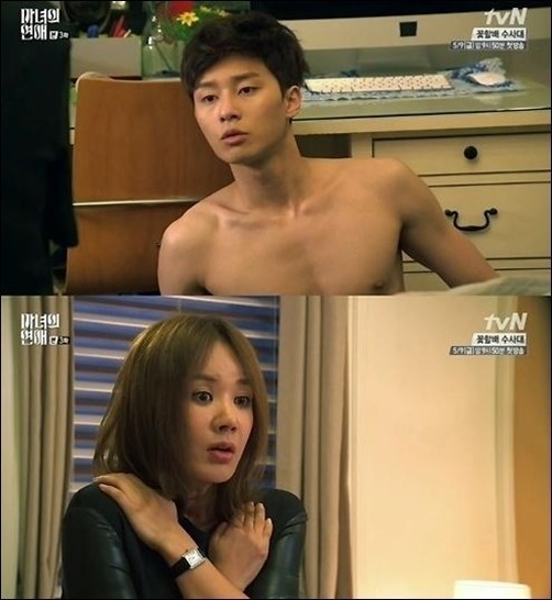 지난 28일 방송된 케이블채널 tvN 월화드라마 ‘마녀의 연애’ 3회에서는 술에 취해 잠자리를 가질 뻔한 반지연(엄정화 분)와 윤동하(박서준 분)의 모습이 그려졌다.