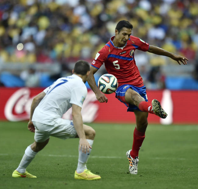 | Costa Rica`s Celso Borges, right, controls the ball past England`s Jack Wilshere during the group D World Cup soccer match between Costa Rica and England at the Mineirao Stadium in Belo Horizonte, Brazil, Tuesday. (AP) |