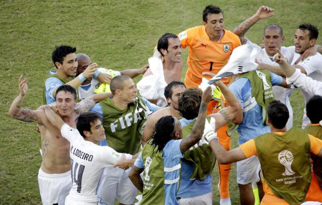 | Uruguay players celebrate after defeating Italy 1-0 during the group D World Cup soccer match between Italy and Uruguay at the Arena das Dunas in Natal, Brazil, Tuesday. (AP) |