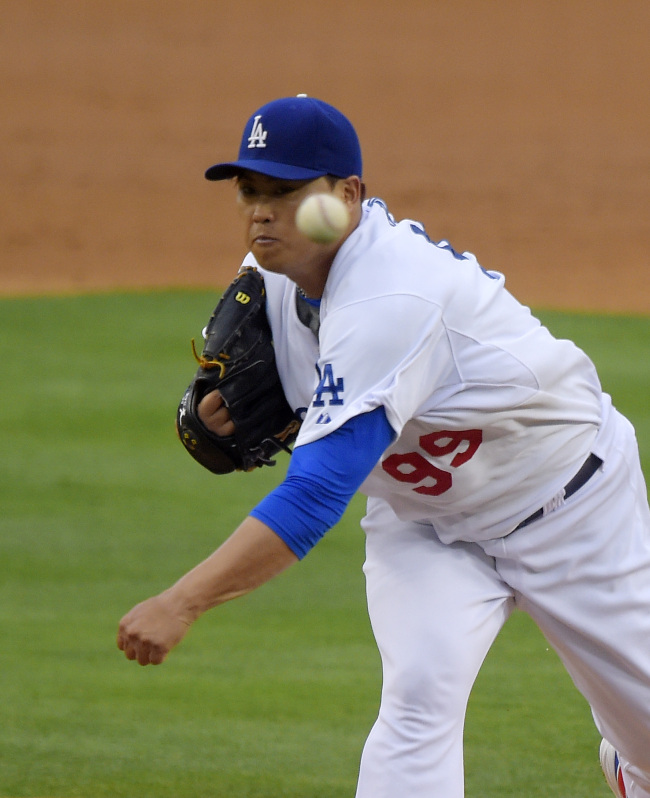| Los Angeles Dodgers pitcher Ryu Hyun-jin throws to the plate on Saturday. (AP-Yonhap) |