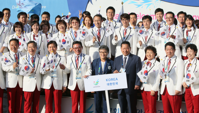 VIBRANT ENTRY: On the eve of the opening of the Asian Games on home soil, the South Korean delegation officially checked in at the athletes’ village on Thursday. Around 50 South Korean officials took part in the welcoming ceremony for the 17th Incheon Asian Games set to kick off on Friday for a 16-day run. (Yonhap)