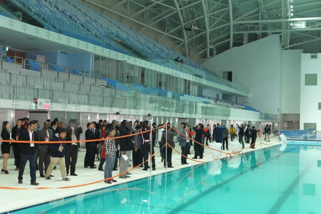 | Gwangju Universiade’s heads of delegation inspect the Nambu University International Aquatics Center on Sunday. Gwangju Universiade Organizing Committee |