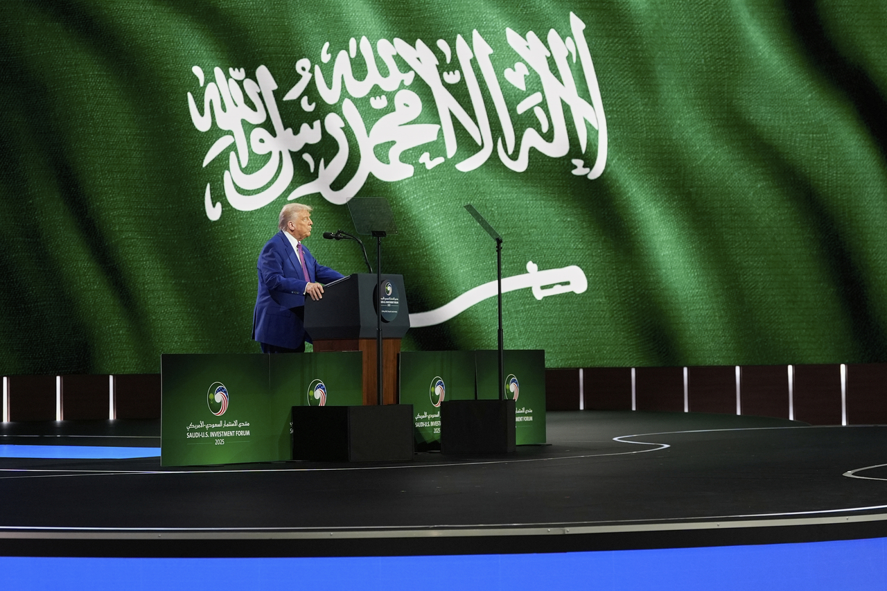| 도널드 트럼프 미국 대통령이 13일(현지시간) 사우디아라비아 수도 리야드에서 열린 사우디·미국 투자포럼에서 연설하고 있다. [AP] |