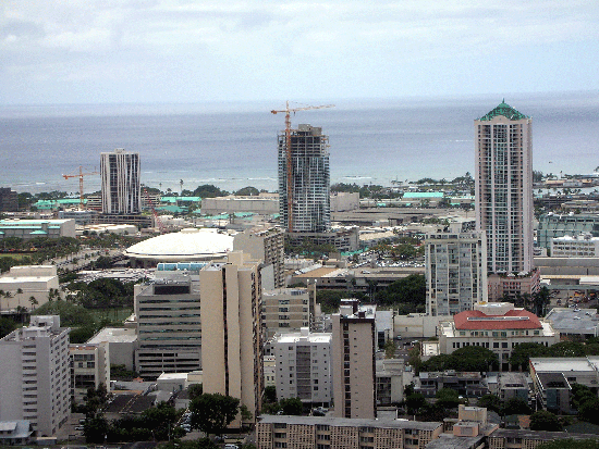 ▲ 한국의 포스코건설이 하와이주 오아후섬 요충지에 신축 중인 909 카피올라니(사진 가운데·8월말 완공) 프로젝트를 비롯, 최근 하와이 일대에는 바다가 내려다보이는 하이라이즈(High-Rise) 럭셔리 콘도 건설 붐이 한창이다. 은퇴를 계획하고 있는 베이미부머 세대들에게 선풍적 인기를 끌며 노른자위 투자지역으로 부상되고 있다. 박상균 기자 / 하와이