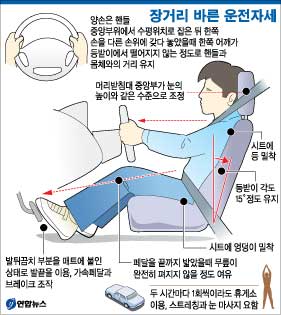 ▲ 장거리 운전시 바른 자세 및 안전운전요령 운전 중 피로 누적과 집중력 저하는 운전자세와 밀접한 관계가 있다. 한 조사에 따르면 운전자의 운전 자세는 상체를 앞으로 기울이면서 운전하는 사람이 전체의 약 40%, 상체를 지나치게 뒤로 기대고 운전하는 사람이 약 30%를 차지한다고 한다. 올바른 자세로 운전하는 사람은 약 30%에 불과한 셈이다. 하지만 올바른 자세로 운전을 할 때는 위험상황이 발생했을 때도 민첩한 대처와 조작이 가능하고 장시간의 운전에도 피로를 덜 느끼게 된다. 좋지 않은 운전 자세 중 가장 흔한 것은 운전석을 앞으로 바싹 당겨서 앉는 자세인데 이 자세는 신체의 유연성을 감소시키고 시야를 좁게 해 위험상황이 닥쳤을 때 신속한 대처를 방해한다. 또한 신체적으로도 목과 어깨에 힘이 들어가고 허리 근육도 긴장하게 돼 피로가 더 빨리 나타나게 된다. 장거리 주행 시에는 머리받침대 뿐만 아니라 좌석의 조정 레버를 이용해 운전자의 체형에 맞게 좌석의 거리, 높이와 등받이 각도를 재조정한 다음 운전해야 한다. 처음에는 과거의 운전자세에 익숙해진 탓으로 다소 불편할지 모르지만 결국에는 올바른 운전자세가 훨씬 안락하고 효율적이다. 올바른 운전자세란 우선 시트에 엉덩이와 등을 밀착시켜 앉아야 하며, 등받이의 각도는 약 15도 정도 뒤로 기울이는 것이 좋다.