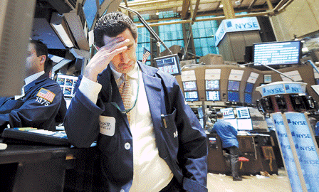 ▲ 뉴욕증권거래소에서 스페셜리스트로 일하고 있는 피터 마차가 23일 은행 국유화 논란 등으로 다우지수가 12년래 최저치로 폭락하자 손을 이마 위에 올린 채 심각한 표정을 짓고 있다. 뉴욕=AP연합뉴스