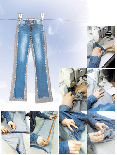 ▶청바지는 좀처럼 늙지 않는다. 물 빠진 청바지는 그 나름대로 빈티지한 멋이 있고, 낡아서 천이 후들후들해진 후에는 ‘구제 바지’라는 이름으로 마니아들의 사랑을 받는다. 문제는 ‘라인(바지 선)’이다. 2~3년 전 부츠컷(엉덩이와 허벅지는 꼭 끼고, 종아리부터 넉넉히 퍼지는 세미 나팔바지) 스타일의 청바지가 크게 유행했다면 지난해부터는 종아리 부분까지 꼭 끼는 스키니진이 선풍적인 인기를 얻고 있다. 새 스키니진을 하나 장만할 수도 있지만, 장롱 안에서 고독을 씹고 있을 부츠컷 청바지를 올 봄 재단장해보는 것도 좋겠다. 재봉틀과 줄자만 있으면 30분 만에 청바지의 몸매가 달라진다. ▶부츠컷의 스키니진 변신기 한때 유행했던 부츠컷 청바지를 꺼내 들고, 밑단의 실밥을 풀어낸다. 실밥을 풀어내지 않고 박음질을 하면 밑단 라인이 울퉁불퉁해 보기 좋지 않다. 바지를 거꾸로 뒤집어 살짝 다림질을 하면 준비 끝. 기준선은 다리 안쪽 부분과 바깥쪽 부분에 2개를 긋는다. 각각 아래와 윗부분에 기준점을 두 개씩 잡고 두 점을 초크로 연결한다. 기준점 ①은 정면에서 봤을 때 엉덩이가 가장 볼록 튀어나온 부분이다. 로우라이즈(허리 라인이 골반 아래까지 내려온 바지)가 아니라면, 보통 허리 라인에서 28~30㎝ 내려온 부분이 기준점이 된다. 기준점 ②는 가랑이가 맞닿은 부분에 잡는다. 스키니진의 일반적인 바지 밑단 폭은 6.5인치. 밑단 가운데 부분에 6.5인치를 남겨두고 양 옆을 동일하게 나눈다. 바깥쪽이 기준점 ③이고, 안쪽이 기준점 ④가 된다. 기준점 ①과 ③을 일직선으로 쭉 연결하고, ②와 ④를 또 하나로 연결한다. 초크선을 따라 재봉틀로 박아준다. 기준선 바깥 부분은 가위로 잘라낸다. 가위로 잘라내 울퉁불퉁한 부분을 재봉틀로 깔끔하게 다듬어도 좋다. 풀어냈던 밑단을 원상복귀 한 후 뒤집어주면 청바지가 몰라보게 날씬해졌다. 트루릴리전처럼 큼직한 스티치 장식이 사선으로 오가거나, 무늬가 화려한 청바지는 리폼이 쉽지 않다. 나팔바지도 스키니진으로 다시 태어나기엔 무리가 있다. 바지 옆 라인을 아무리 줄여도 엉덩이 부분이 헐렁해 ‘배기바지(일명 ‘똥싼 바지’)'처럼 되기 쉽다. 엉덩이와 허벅지 부분은 꼭 끼면서 종아리 부분이 헐렁해지는 일자나 부츠컷 스타일이 리폼하기엔 최적의 청바지다. ▶체크 청치마 지난해부터 시작된 체크 열풍은 리폼 시장에서도 예외가 아니다. 주로 치마 밑단이나 허리 부분에 체크 무늬 천 조각을 둘러 멋을 낸다. 우선 청바지의 두 다리 부분을 싹둑 잘라낸다. 길이 조절은 취향에 따라. 체크 천 조각을 이어붙였을 때 길이가 늘어나는 점을 감안한다. 기준점 ②부분을 도려낸 후, 갈라진 부분을 재봉틀로 박아 통치마를 만든다. 그 위에 체크 천조각을 두르고 시침바늘로 고정시킨 후, 뒤집어서 재봉틀로 치마 밑단을 박는다. 체크 천을 접어 주름을 만든 후 박으면 더 로맨틱하다. 또는 같은 방식으로 통치마를 만들고 밑단을 깔끔하게 처리한 후, 허리 자락에 체크 천을 덧대는 것도 멋스럽다. 허리띠처럼 천을 이어붙인 뒤, 배꼽 앞에서 리본을 만들어 재봉틀로 고정하면 된다. 김윤희기자 <도움말=실과바늘, 신촌현대사, 촬영협조=실과 바늘>
