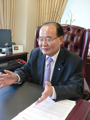 ▲ 유재승 한미은행장이 LA한인타운내 위치한 은행 본점 의 집무실에서 취임 1주년을 맞은 소감과 자신의 목표를 말하고 있다.