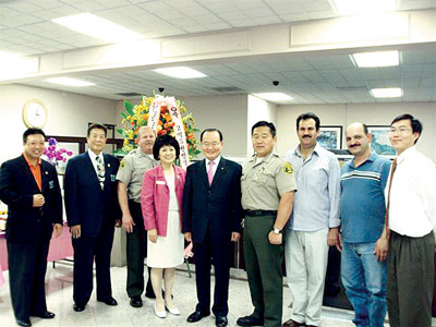 예금 2억5000만달러를 달성한 롤렌하이츠 지점을 찾은 유재승 행장(가운데)이 박순란 지점장(왼쪽 4번째) 및 인근 지역 경찰, 한인단체장, 주요고객 등과 함께 기념사진을 찍고 있다. |