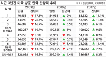 올해 상반기에 미국을 찾은 한국 관광객들이 크게 줄어든 것으로 조사됐다. 연방 상무부 산하 국제무역국이 최근 공개한 자료에 따르면 올 상반기 6개월 동안 미국에 입국한 한국인 방문객수는 32만6058명이었다. 이는 지난해 같은 기간 동안의 한국인 방문객수 39만2010명에 비해 16.8%(6만 5952명) 줄어든 것이다. 한국인 방문객이 감소한 것은 심화된 경기침체와 달러대비 원화 약세가 유지된 환율, 신종 플루 등의 영향을 크게 받았기 때문으로 풀이된다. 올 상반기 중 1분기의 원화 평균 환율은 1달러당 1415.82원을 기록, 1997년부터 2년여간 한국이 겪은 IMF사태 이후 분기 최대치를 기록했다. 월평균 1달러당 1429.46원의 환율을 기록한 지난 2월 한국인 방문객수는 무려 20% 이상 감소했으나 이후 감소폭이 둔화되다가 지난 4월말부터 불거진 신종플루의 여파로 다시 급격한 하락세로 이어져 5월에만 전년 같은 기간 대비 19.4%의 감소폭을 나타냈다. 미국을 찾는 한국인 수가 줄어들자 올 상반기 인천을 출발, LA에 도착하는 노선의 대한항공과 아시아나항공의 직항편 탑승객수 역시 각각 1년전 같은 기간에 비해 6.4%포인트와 7.4%포인트가 낮아지는 등 항공, 관광, 호텔, 요식 등 관련 업계의 매출 급감으로 이어져 결국 일부 업체들은 이 기간을 전후해 폐업하기도 했다. 2008년 통계자료를 근거로 산출한 한국 관광객들의 현지 여행 경비는 지난해 같은 기간에 비해 1억 7787만여 달러가 줄어든 8억7938만여 달러였다. 이 기간 국가별 미국 방문객수는 캐나다가 825만 2665명으로 가장 많았으며 한국은 멕시코(254만 6751명), 영국(178만 1400명), 일본(132만 29명) 독일(76만 4158명), 프랑스(54만 763명), 브라질(37만 9493명)에 이어 8위에 해당됐다.