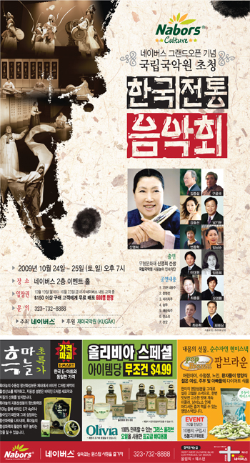올림픽과 웨스턴 코너에 새롭게 오픈한 원스톱 샤핑 공간 ‘네이버스(대표 션 리)’에서 그랜드 오픈을 기념해 한국 전통음악회를 개최한다. 오는 주말인 24일과 25일 양일간 네이버스 2층 이벤트홀에서 펼쳐질 이번 공연은 무형 문화재인 신영희 선생과 한국의 국립국악원 사물놀이 민속악단이 출연해 25현4중주, 춘앵전, 피리독주, 승무, 해금독주, 판소리, 판굿 등을 펼치게 된다. 특히 이번 공연에서는 미주 한인들에게는 첫선을 보이는 춘앵전이 공연될 예정이다. 춘앵전은 궁중 무용 중에서도 유일한 독무 작품으로 세련되고 우아한 무용으로 손꼽히고 있어 화려한 무복과 우아한 음악에 맞춘 장엄한 춤 사위가 한국 전통무용의 정수를 보여줄 것으로 기대된다. 또한 크로스 오버 유행을 타고 새롭게 해석되고 있는 해금 독주 및 피리 독주 등도 미주 한인들에게는 기대할만한 공연 아이템이 될 듯. 네이버스 이벤트홀에서 열리는 공연인 관계로 인원이 제한된다. 무료 배포 600명 한정.