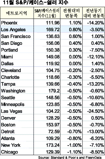 상승세를 보이던 미국 내 20개 대도시 지역의 주택가격이 지난해 11월 소폭 하락세로 돌아선 것으로 나타났다. 하지만 LA 지역은 상승세를 유지했다. 26일 발표된 스탠더드 앤드 푸어스(S&P)/케이스-쉴러 지수에 따르면 20개 대도시 지역의 주택가격을 나타내는 작년 11월의 지수는 전달보다 0.2% 하락했다. 11월 지수는 1년 전 같은 기간과 비교하면 4.5% 떨어졌다. 애초 보합으로 발표됐던 10월 지수는 0.1% 하락으로 수정됐다. 시장 전문가들은 11월 지수가 0.1% 상승할 것으로 예상했었다. 하지만, 계절적 요인을 감안한 계절조정치는 10월에 0.3% 상승한 데 이어 11월에도 0.2% 오른 것으로 나타났다. 미 전국 지수가 하락했지만 LA지역은 169.72를 나타내 10월에 비해 0.8%가 상승했다. 이는 전월대비로는 애리조나주 피닉스(1.10%상승) 다음으로 큰 폭의 상승이다. LA외에도 샌프란시스코와 샌디에고도 각각 전월대비 0.6%와 0.4%가 상승해 캘리포니아주는 주택가격이 회복세를 보이고 있음을 보여줬다. 반면 시카고, 뉴욕, 애틀랜타 등은 20개 도시 중 하락폭이 가장 큰 것으로 나타났다. 한편 20개 대도시 지수와는 반대로 연방주택금융공사(FHFA)가 발표한 11월 주택가격지수는 예상치를 뛰어넘는 전월대비 0.7%의 상승률을 기록했다. 26일 블룸버그통신은 FHFA가 발표한 미국의 11월 주택가격지수가 전월대비 0.7% 상승했으며 이는 전문가 예상치 0.2%를 웃도는 수준이다. 이 지수에서도 캘리포니아는 주택가격이 2.3% 오르며 상승세를 주도했다. 성제환 기자