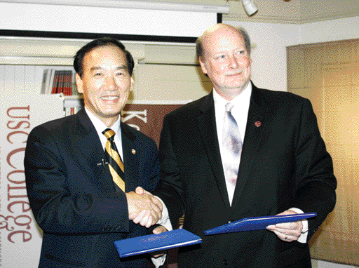 | ▲박계동 국회 사무총장(왼쪽)과 하워드 길먼 USC 인문대학장이 28일 USC의 도산 안창호 하우스에서 국회사무처와 USC 간의 상호협력을 관한 양해각서(MOU)에 서명한 뒤 악수를 나누고 있다. ⓒ2009 Koreaheraldbiz.com | |