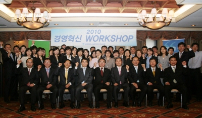 ▲22일 경영혁신 워크샵을 가진 우리아메리카은행의 간부들이 오규회 행장 (맨 앞줄 가운데)을 중심을 모여 앉아 화이팅을 외치고 있다. ⓒ2010 Koreaheraldbiz.com | |