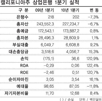 캘리포니아주의 은행(Commercial Banks)들이 올해 1분기에 총 3660만달러의 순익을 올린 것으로 나타났다. 8일 연방예금보험공사(FDIC)와 캘리포니아 금융감독국(DFI)이 발표한 자료에 따르면 캘리포니아주내 상업은행들은 올해 1분기에 총 3660만달러의 순익을 올린 것으로 나타났다. 이는 지난해 1분기 1억7510만달러의 손실을 기록했던 것과 큰 차이를 보이고 있다. 주내 은행들이 1분기에 이같은 순익을 올린 데는 대손충당금 추가분이 1년전에 비해 크게 줄어든 것이 가장 큰 요인으로 분석된다. 지난해 1분기에 은행들은 총 11억달러를 추가했으나 올해 1분기에는 이보다 3억340만달러나 적은 8억3970만달러를 추가했다. 또 순이자마진은 3.05%에서 3.54%로 향상됐다. 총자산대비 당기순이익을 나타내는 총자산이익율(ROA·Return On Assets)은 1년전 -0.29%에서 0.06%로 크게 향상됐고 당기순이익을 자기자본평균치로 나눈 자기자본 이익률(ROE·Return On Equity)도 -2.46%에서 0.51%로 좋아졌다. 총 연체대출은 92억달러에서 4.9%가 줄어든 87억달러로 줄었다. 반면 부실대출(Noncurrent Loans & Leases)은 60억달러에서 66억달러로 9.2%가 늘어났다. 또 1분기 현재 은행들의 대손충당금 규모도 지난해 35억달러에서 5억3810만달러가 늘어난 41억달러인 것으로 나타났다. 이로 인해 부실대출 대비 대손충당금 커버 가능비율(reserve coverage of noncurrent loans)은 61.38%에서 58.16%로 줄었다. 주내 상업은행의 수는 지난해 1분기 218개에서 올해는 16개가 줄어든 202개로 줄었다. 은행들의 총 자산의 합계는 2272억3470만달러로 1년전(2435억5230만달러)에 비해 6.7%가 감소했고 대출도 1702억1590만달러에서 11.1%가 줄어든 1513억6280만달러로 나타났다.하지만 예금은 1725억4310만달러에서 1738억8720만달러로 0.8% 늘어난 것으로 조사됐다.