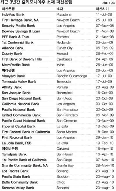 지난 주말 캘리포니아주 은행 4곳을 포함한 총 8개 은행이 폐쇄조치돼 올들어 파산 은행의 수가 118개로 늘어났다. 특히 이번에 파산한 캘리포니아 소재 은행 2곳을 외국계은행이 인수해 큰 주목을 끌고 있다. 연방예금보험공사(FDIC)는 지난 20일 시카고에 위치한 쇼어뱅크(ShoreBank)를 비롯해 총 8개 은행을 폐쇄조치한다고 발표했다. 특히 이날 파산한 은행중 절반인 4곳이 캘리포니아주에 본사를 두고 있어 그동안 잠잠하던 캘리포니아주 은행 파산이 다시 고개를 드는 것이 아니냐는 우려를 낳고 있다. 이로써 올들어 파산한 캘리포니아주 소재 은행은 10개로 늘어났으며 이는 지난해 같은기간 8개에 비해 2개가 늘어난 것이다. 또한 지난 2008년 7월 파사디나 소재 인디맥뱅크가 파산을 시작으로 지난 3년간 캘리포니아에서는 총 32개 은행이 파산했고 이중에는 한인은행인 미래은행과 아이비은행도 포함돼 있다. 이날 폐쇄조치된 캘리포니아 소재 은행은 소노마 소재 소노마밸리뱅크(Sonoma Valley Bank), 솔뱅 소재 로스파드레스뱅크(Los Padres Bank), 치코 소재 뷰트커뮤니티뱅크(Butte Community Bank), 그리고 스톡튼소재 퍼시픽스테이트뱅크(Pacific State Bank)로 로스파드레스뱅크를 제외하고는 모두 북가주 은행들이다.
