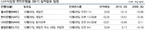 어닝시즌 속에서 미국내 주요기업들이 속속 실적을 발표하고 있는 가운데 나스닥상장 한인은행들도 25일 나라은행을 시작으로 이번 주에 모두 올해 3분기 실적을 내놓는다. 우선 나라은행은 한인은행 중에서는 가장 먼저 25일 뉴욕증시 마감 후 3분기 실적을 발표한다. 이어 26일 개장 전에 윌셔은행이 실적을 내놓고 한미은행과 중앙은행은 각각 28일 실적에 대한 컨퍼런스콜을 예정해 놓고 있다. SNL파이낸셜이 발표한 자료에 따르면 지난 18일까지 3분기 실적을 내놓은 캘리포니아주 소재 커뮤니티은행 16개의 실적을 종합한 결과 평균 순익이 전년동기에 비해서는 66%나 증가했고 전분기인 2분기와 비교해도 23%나 늘어난 것으로 나타나 전체적으로는 캘리포니아주 은행들이 3분기에 선전한 것으로 나타나고 있다. 한인은행들에 대한 전문가들의 예상도 지난해나 전분기에 비해 실적이 나아질 것으로 예상되고 있다. 하지만 은행권에서는 순익이나 손실이 얼마나 나오냐 보다는 장기화되고 있는 경기침체 속에서 앞으로 은행이 잘 이겨내고 영업력을 키워낼 수 있느냐가 중요하기 때문에 자산건전성이 얼마나 개선됐느냐에 보다 관심을 두고 있다. 윌셔은행의 경우 2분기에 큰 폭의 손실을 기록하면서 어려움을 겪었지만 일단 전문가들의 예상은 주당 3센트의 순익을 내다보고 있다. 현재로는 이 예상치에 부합할 것으로 보이며 차이가 나더라도 크지는 않을 전망이다. 윌셔는 자산건전성 확보를 위한 작업이 3분기에도 계속된 것으로 보여 이에 따라 순익이 아닌 소폭의 손실을 기록하는 것도 완전히 배제할 수는 없는 상황이다. 다만 순익이냐 손실이냐 보다는 1분기에 늘어난 부실대출이 2분기에 손실로 이어진 만큼 이번 실적발표에서도 부실대출과 손실처리의 변화폭이 어느 정도이냐가 최대 관심거리다. 지난 7월 증자에 성공하면서 한국의 우리금융의 인수 승인을 기다리고 있는 한미은행은 3분기에도 자산건전성을 높히려는 노력이 계속돼 손실을 기록할 것으로 보인다. 전문가들은 주당 25센트의 손실을 전망하고 있다. 전분기에 주당 45센트라는 큰 손실을 기록한 나라은행은 그동안 한인은행 중에서는 가장 과감하게 대출에 대한 손실처리를 하는 등 자산건전성을 확보하려는 의지를 보여왔다. 이러한 움직임에는 큰 변화는 없는 것으로 보이며 어느 정도 성과가 있는 것으로 파악돼 전문가들도 큰 손실 보다는 주당 1센트 정도로 예상하고 있다. 중앙은행은 아이비은행 인수로 인한 효과로 인해 이번 3분기에도 4대 은행 중 가장 큰 순익인 주당 4센트의 순익을 전문가들은 예상하고 있다.
