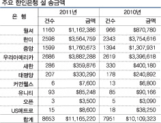 올 설날에 한인들의 한국으로의 송금이 지난해에 비해 소폭 늘어났다. 지난달 말부터 지난주까지 한인은행은 설을 맞아 개인송금에 한해 무료송금 서비스를 실시했는데 8일까지 집계된 한인은행 10곳(윌셔, 한미, 중앙, 우리아메리카, 새한, 태평양, 커먼웰스, 유니티, 오픈, US메트로)의 한국행 무료송금액은 총 1116만5220달러로 조사돼 지난해 이들 은행을 통한 송금액 1010만9323달러에 비해 10.4%인 105만5897달러가 늘어난 것으로 나타났다. 송금건수도 올해는 8653건으로 지난해 7951건 보다 702건이나 늘어났고 송금 건당 평균 금액도 지난해에는 1271달러였으나 올해는 1290달러로 늘어났다. 10개 은행 중 6개 은행을 통한 송금액이 늘어난 것으로 조사됐다. 올 설 무료 송금기간에 가장 많은 송금액을 기록한 은행은 우리아메리카은행인 것으로 조사됐다. LA에 본사를 둔 은행 중에서는 한미은행이 가장 많았다. 이처럼 설에 한국으로의 송금이 늘어난 것은 지난해에는 불경기로 인해 한인들의 여유자금이 넉넉하지 않았지만 올해는 조금 사정이 나아지면서 송금액이 늘어난 것으로 풀이된다. 따라서 송금액 증가는 지난해 보다 한인커뮤니티 경기 상황도 올해 점차 좋아지고 있다는 것을 보여주는 것으로 풀이된다. 특히 큰 차이를 보이지는 않았지만 지난해 2월 환율이 1150원대를 기록했던 것과 비교할 때 올해 2월 환율이 1100원대로 낮아졌음에도 송금액이 늘어난 것은 한인들의 사정이 나아졌다는 것을 보여준다. 또한 건당 송금액이 늘어난 것은 올해 한국 설 연휴가 주말을 끼고 있어 예년에 비해 크게 늘어난 것에 맞춰 송금액을 좀 더 늘린 것으로 보인다.