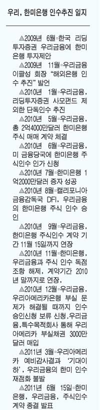 지난해 5월 주식인수 계약을 체결한 뒤 1년 넘게 끌어온 우리금융의 한미은행 인수가 결국 양측 합의하에 계약이 종료됐다. 몇년전 하나금융의 커먼웰스은행 인수 무산에 이어 또 한번 한국 금융기관의 미국 금융회사 인수 실패라는 전례를 남기게 돼 한국금융권은 미국시장 진입장벽이 만만치 않음을 실감하게 됐다.
