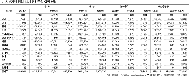 ▲ 오랜만에 찾아온 흑자 분위기 캘리포니아주와 워싱턴주, 그리고 하와이주까지 미 서부지역에서 영업 중인 한인은행 14곳이 지난해 기록한 손익은 총 2억4795만달러 손실이었다. 특히 지난해 순익을 기록한 은행은 중앙은행과 커먼웰스은행, 그리고 유니뱅크 뿐이었다. 이러한 적자 분위가 올해 1분기에는 흑자 분위기로 돌아섰다. 전체적으로 보면 올해 1분기 2396만달러 손실이자만 이는 윌셔은행이 대대적인 부실정리 작업을 하는 바람에 5000만달러의 손실을 기록했고 태평양은행이 366만달러의 손실을 냈기 때문 전체적으로는 손실을 기록했지만 12개 은행은 긴 손실의 터널을 뚫고 마침내 흑자로 돌아서는데 성공했고 은행가가 흑자 분위기로 돌아선 것도 분명하다. 아직 실적 발표는 나오지 않았지만 지난달로 끝난 2분기에도 1분기와 그리 다른 성적표가 나오지는 않을 전망이다. 1분기에 흑자를 낸 은행들은 흑자를 이어갈 것으로 보인다. 손실을 내는 은행들도 1분기 보다는 그 규모가 적어질 것으로 예상된다.