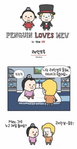 제 366화 ‘레인보우’ 편에는 2014년 새해 정윤혜와 트위터 멘션을 주고받은 사연이 공개돼 웃음을 자아냈다. ‘펭귄 러브즈 메브’는 한국여자 펭귄과 영국남자 메브의 실제 러브스토리를 주제로 한 웹툰이다.