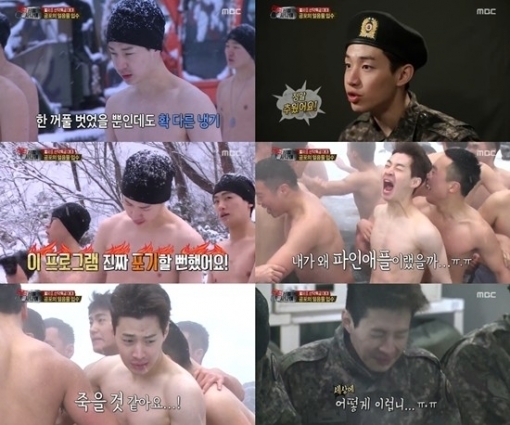 하지만 그도 어쩔 수 없이 ‘파인애플’ 선임에 의해 얼음물에 입수했다. 고통에 잔뜩 일그러진 그의 얼굴에서 나오는 괴성은 보는 이들의 웃음을 자아냈다.