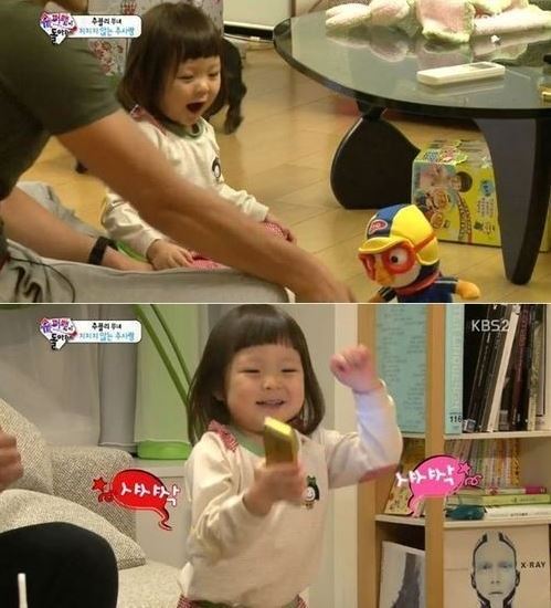 [헤럴드생생뉴스]추성훈 딸 추사랑이 뽀로로 인형을 선물 받고 셔플댄스를 추며 기쁨을 드러냈다.