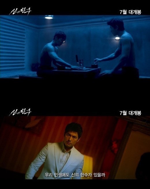 배급사 쇼박스(주)미디어플렉스는 12일 ‘신의 한 수’ 1차 예고편과 포스터를 공개했다. 예고편에는 정우성과 최진혁이 냉동창고에서 상의를 탈의한 채 1대1 대국을 벌이는 모습이 담겨 있다.