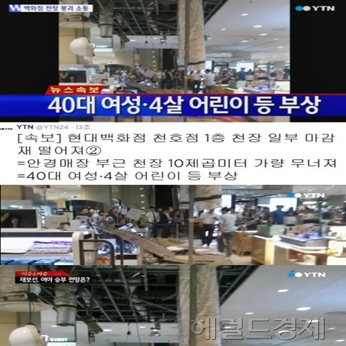 | ▲현대백화점 천호점 천장 마감재 붕괴 삼풍백화점 붕괴 (사진=YTN 방송캡처/ 트위터) |