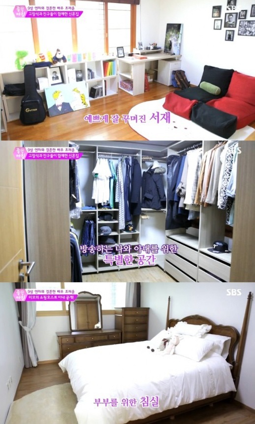 이날 조재윤은 아내 조은애를 위해 드레스룸은 물론 서재까지 마련해 아내에 대한 각별한 애정을 드러냈다. 특히 조재윤은 소파 위에 웨딩화보를 진열하고 해먹 등 아기자기한 소품들과 그릇들을 자랑해 부러움을 자아냈다.