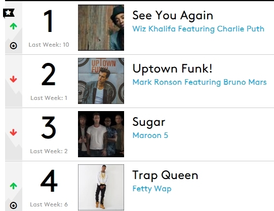 ‘See You Again’은 미국, 영국, 캐나다, 호주 등 93개국의 아이튠즈 차트에서도 1위를 기록, 영화의 전세계적인 인기를 실감하게 했다. 아울러 국내 주요 음원사이트인 ‘엠넷’의 장르별 차트 팝 부문에서도 2위에 올라 눈길을 끈다.