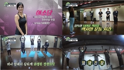 탑독 멤버들은 미녀 선생님의 등장에 기쁨을 감추지 못한 채 힘든 동작이 이어지는 동안에도 연신 미소 띤 얼굴로 땀을 뻘뻘 흘리며 촬영을 이어갔다는 후문.