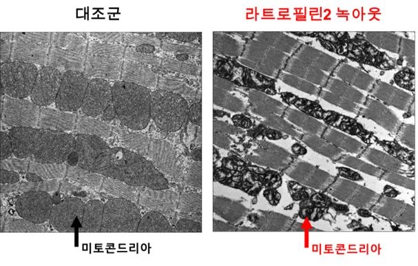 | [그림2] 전자현미경 검사에서 라트로필린-2 녹아웃 시 심근섬유 분리 및 미토콘드리아 구조 손상: 라트로필린2 결손 심근세포는 대조군에 비해 심근섬유 간격이 벌어지고 미토콘드리아 구조가 파괴되어 에너지 생산 효율 저하와 수축력 감소로 심부전이 발생할 수 있음 |