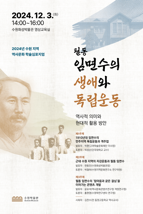 수원박물관은 12월 3일 오후 2시 수원화성박물관 영상교육실에서 ‘필동 임면수의 생애와 독립운동 : 역사적 의미와 현대적 활용 방안’을 주제로 학술심포지엄을 개최한다.