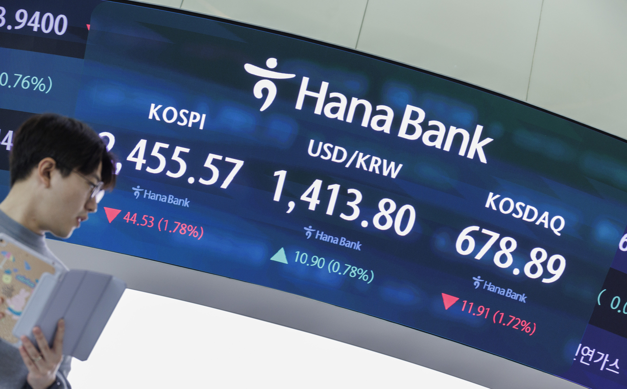 | 윤석열 대통령이 비상계엄을 선언했다 국회의 의결로 계엄을 해제한 4일 오전 서울 중구 하나은행 딜링룸 전광판에 이날 거래를 시작한 코스피, 원/달러 환율, 코스닥 지수가 표시돼 있다. [연합] |