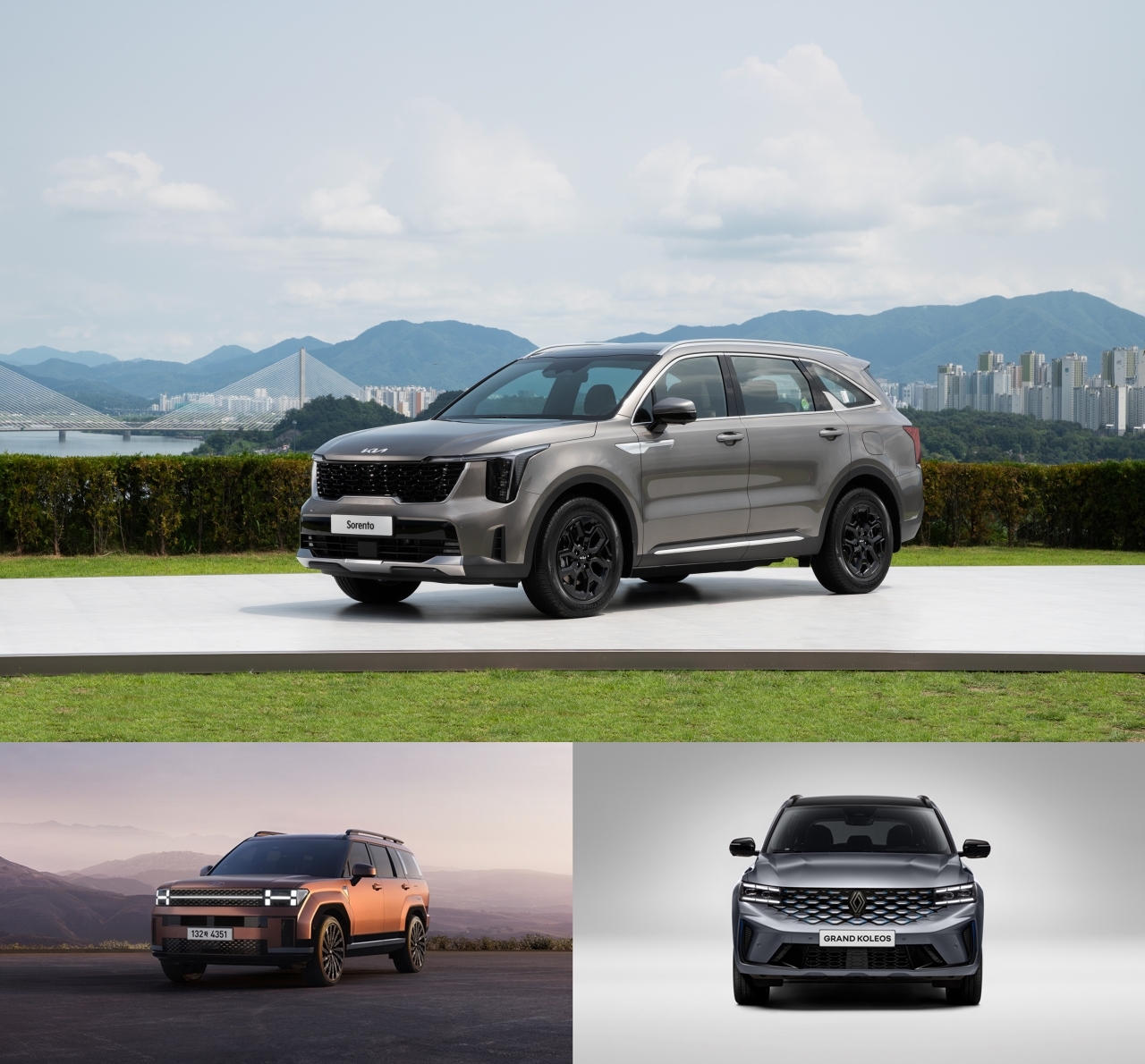 | 기아 쏘렌토(상단부터 시계 반대반향)와 현대차 싼타페, 르노코리아 그랑 콜레오스. [각사 제공] |