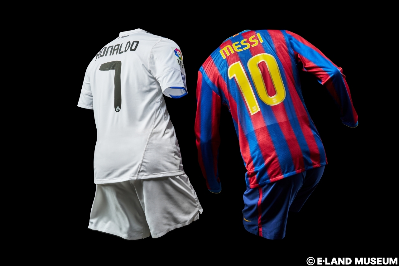 | 왼쪽부터, 호날두 2010-11시즌 라리가 Game-Used 레알 마드리드 저지, 메시 2009-10시즌 라리가 Game-Used FC 바르셀로나 저지[이랜드 제공] |