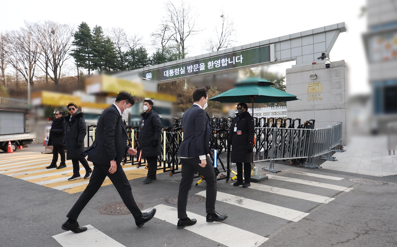 | ‘12·3 비상계엄 사태’ 수사를 위해 대통령실 압수수색에 나선 경찰 국가수사본부(국수본) 관계자들이 11일 서울 용산 대통령실 민원실로 향하고 있다. [연합] |