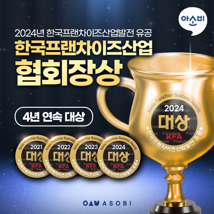 유치~초2 전문 교육원 아소비가 ‘2024 제25회 한국프랜차이즈산업발전 유공’에서 ‘한국프랜차이즈산업 협회장상’을 수상했다고 19일 밝혔다.