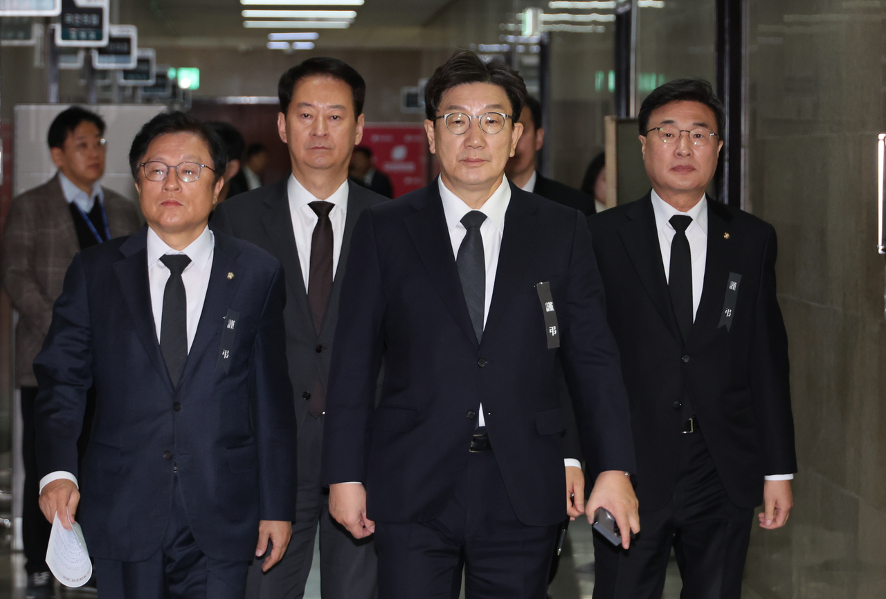 | 권성동 국민의힘 원내대표와 원내지도부가 12월 31일 오전 서울 여의도 국회에서 열린 원내대책회의에 참석하고 있다. [연합] |