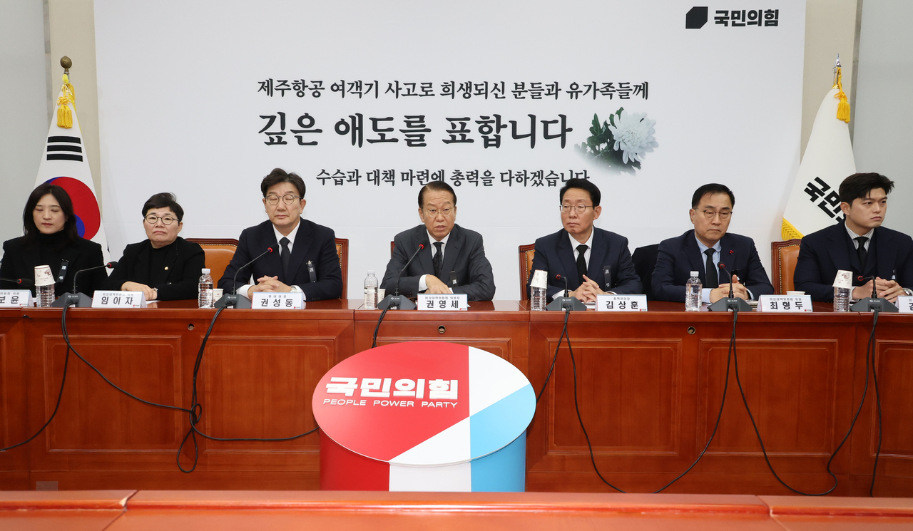 | 권영세 국민의힘 비상대책위원장과 비대위원들이 12월 31일 오후 국회에서 열린 제주항공 여객기사고 긴급대책회의에서 발언하고 있다. 왼쪽부터 최보윤·임이자 비대위원, 권성동 원내대표, 권영세 비대위원장, 김상훈 정책위의장, 최형두·김용태 비대위원. [연합] |
