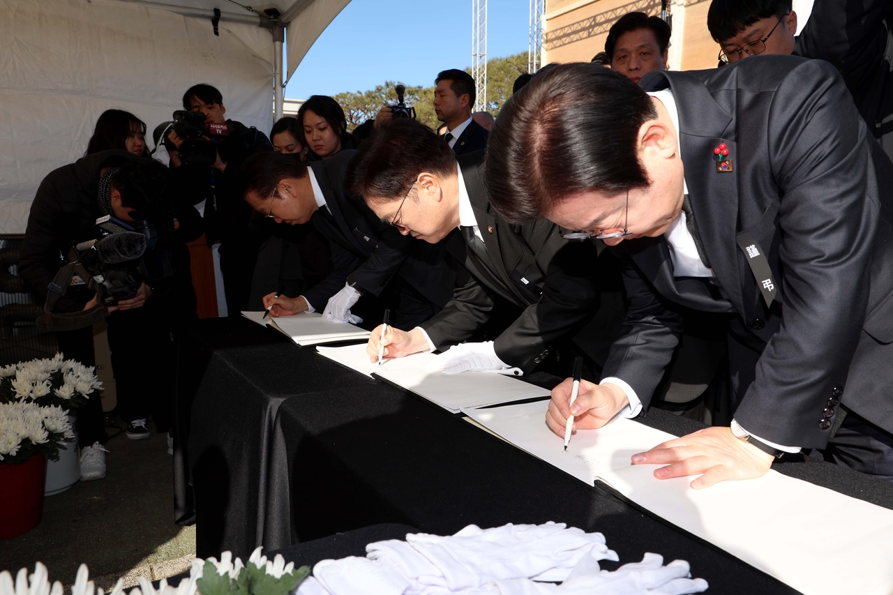 | 국민의힘 권영세 비상대책위원장(왼쪽부터), 우원식 국회의장, 더불어민주당 이재명 대표가 31일 서울 여의도 국회에 마련된 제주항공 여객기 사고 희생자 합동분향소에서 방명록을 작성하고 있다. [공동취재][연합] |