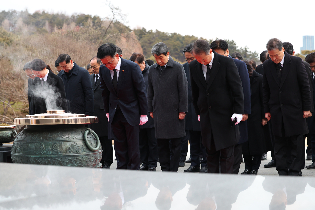 | 최상목 대통령 권한대행 부총리 겸 기획재정부 장관과 국무위원들이 2025년 새해 첫날인 1일 국립서울현충원을 찾아 참배하고 있다. |