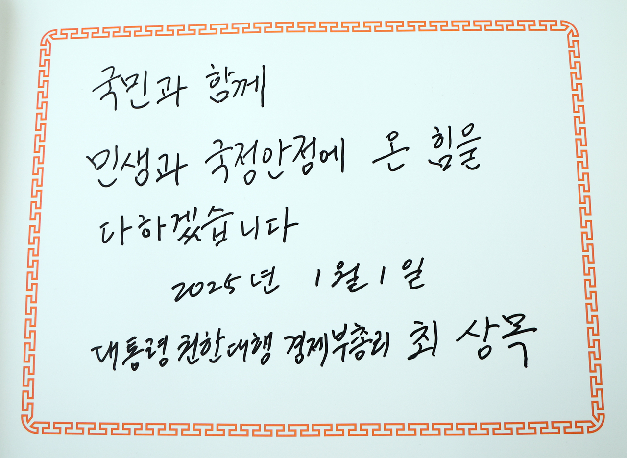 방명록에는 ‘국민과 함께 민생과 국정안정에 온 힘을 다하겠습니다. 2025년 1월 1일 대통령 권한대행 경제부총리 최상목’이라고 적었다.