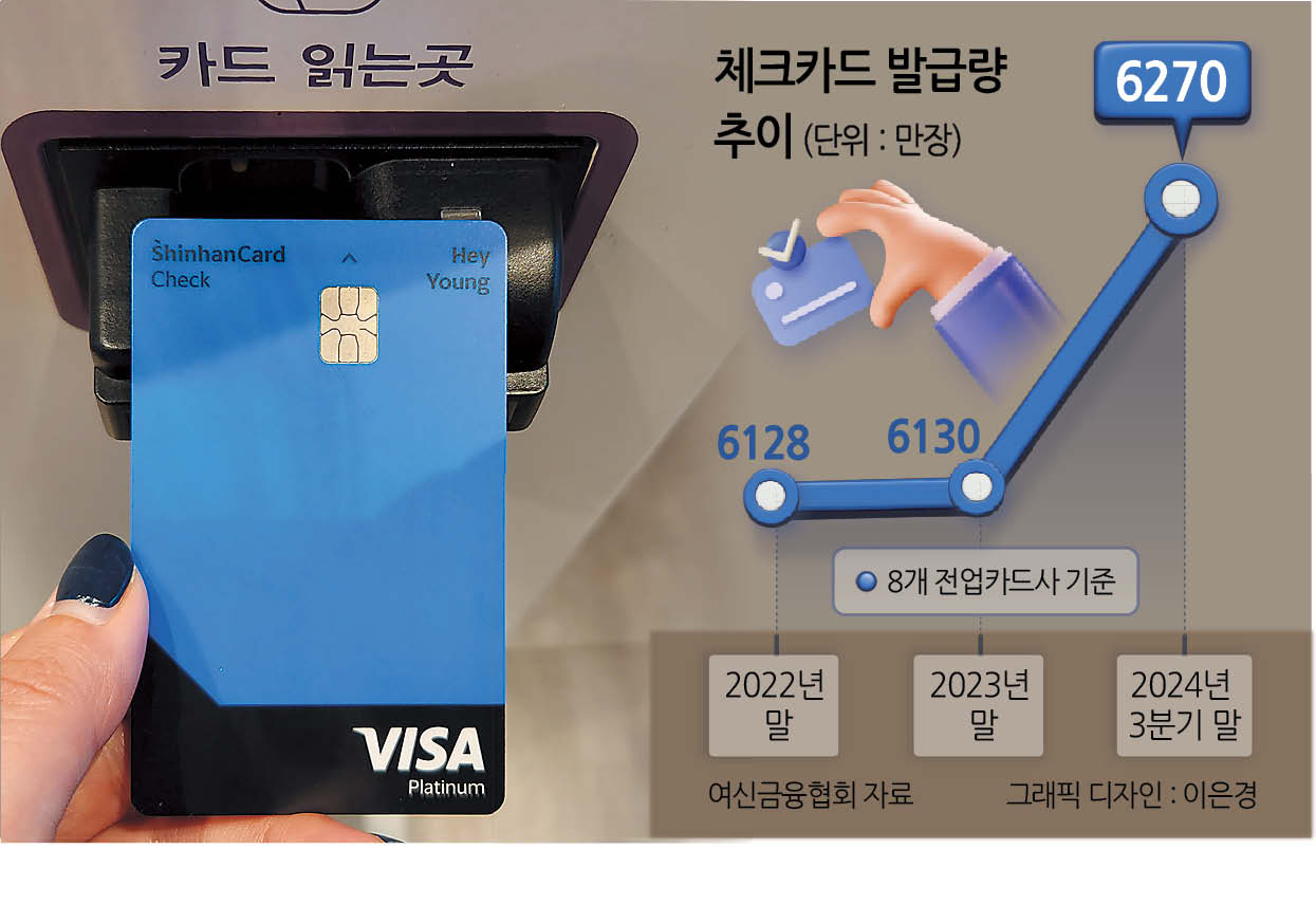 10일 여신금융협회에 따르면, 8개 카드사(신한·KB국민·현대·삼성·비씨·롯데·우리·하나)의 지난해 3분기 기준 체크카드 총 발급 건수는 6269만5000개로, 전년도 말(6129만7000개) 대비 139만8000장이 증가한 것으로 나타났다.