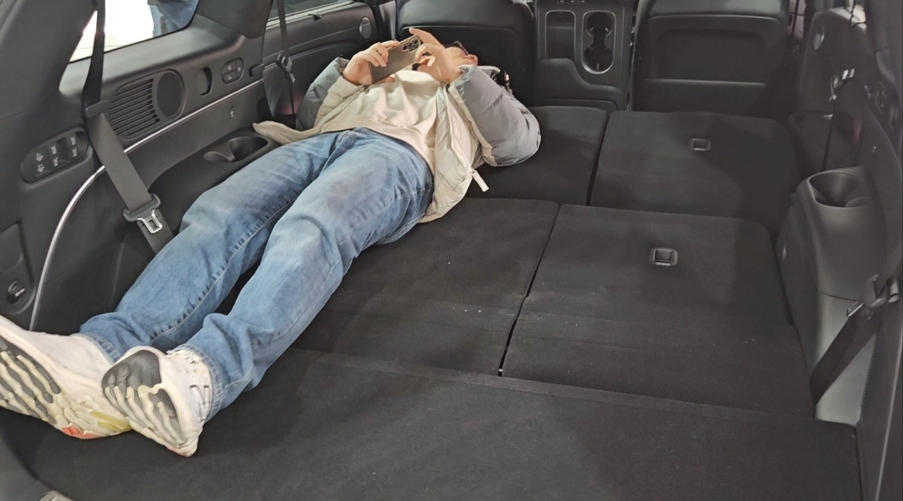 | 디 올 뉴 팰리세이드는 2, 3열 폴딩 시 성인 남성이 편하게 누울 수 있을 만큼의 여유로운 공간을 확보할 수 있다. 서재근 기자 |