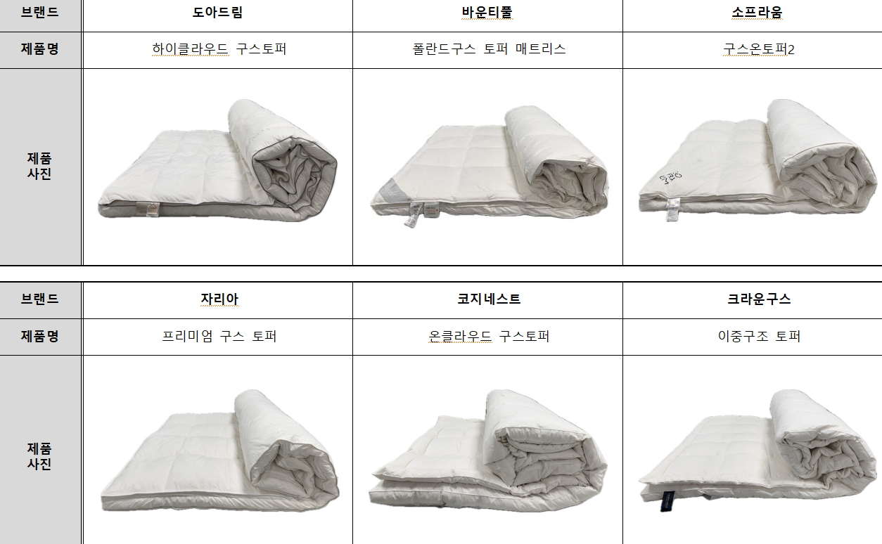 한국소비자원은 16일 구스다운 소재 이중구조 매트리스 토퍼 6개 제품에 대한 거위털 비율 등 충전재의 품질 품질과 유해 물질 등 시험·평가 결과를 공개했다.