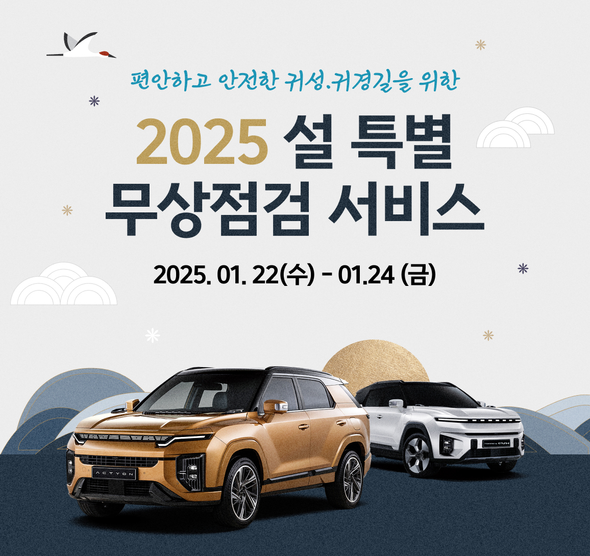 [헤럴드경제=양대근 기자] KG 모빌리티(이하 KGM)가 한 주 앞으로 다가온 설 명절을 맞아, 장거리 운행으로 고향을 찾는 고객들에게 편의 제공을 위해 ‘2025년 설 특별 차량점검 서비스’를 시행한다고 21일 밝혔다.